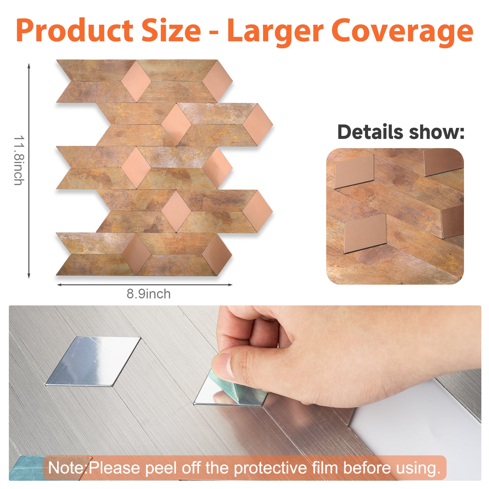 • Unique Geometric Mirror Design: made of PVC mixed-metal material with 3D diamond-shaped metal decor, this PVC backsplash not only features a unique appearance but also is anti-scratch, high-impact, color-fast, more durable, and stronger than other plastic self-adhesive tiles.