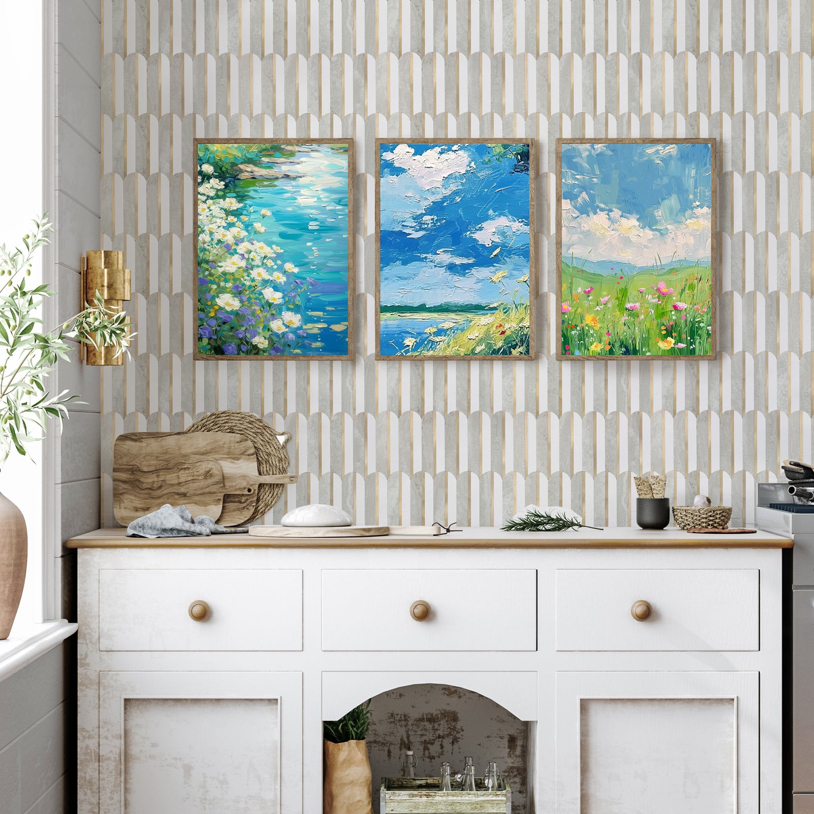 smooth ceramic tiles backsplash, smooth glass tiles backsplash, acrylic wall panel, pained gypsum, wall linoleum, stainless metal, mirror, laminate, wallpaper (if some corners are peeling, just peel them off and install tiles over them.