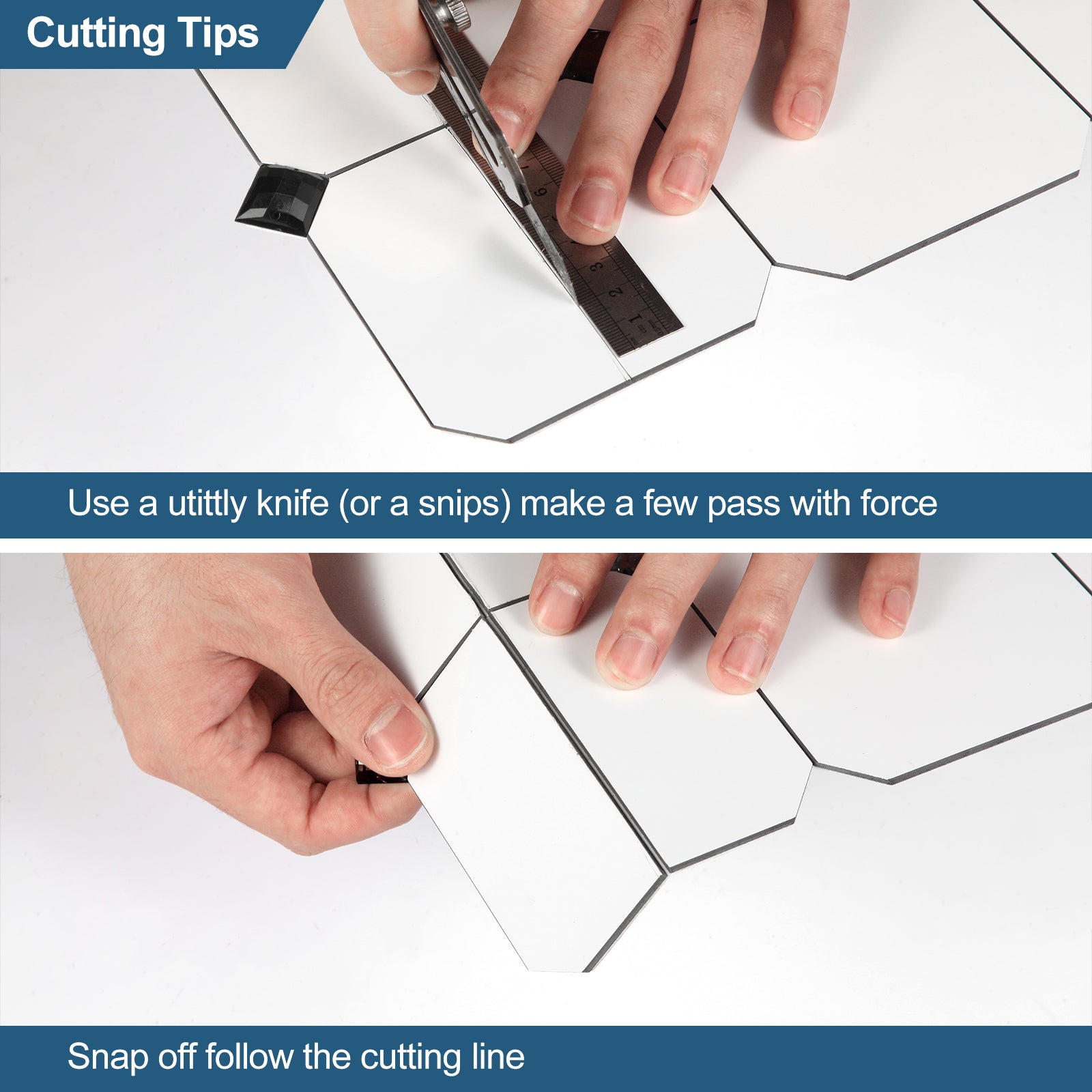 The gap between each tile is 3M adhesive foam; you can easily separate them with a utility knife.If you need to cut tiles to get a straight edge, please kindly use good industrial scissors or X-Acto knife to cut the tile. The back of the tile is a composite PVC layer, which will be easier to cut than the metal surface.